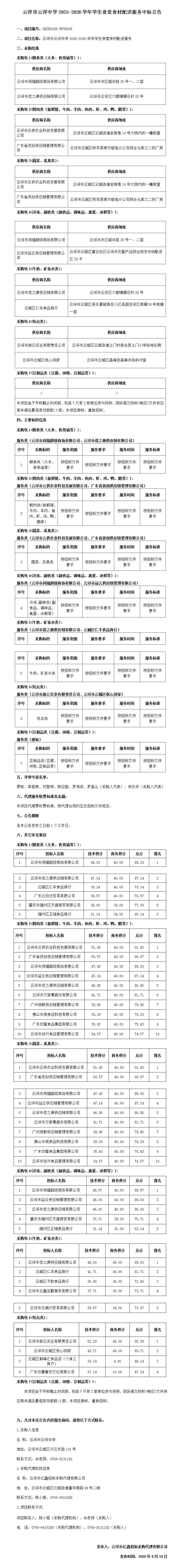 云浮市云浮中學(xué)2025-2026學(xué)年學(xué)生食堂食材配送服務(wù)中標公告